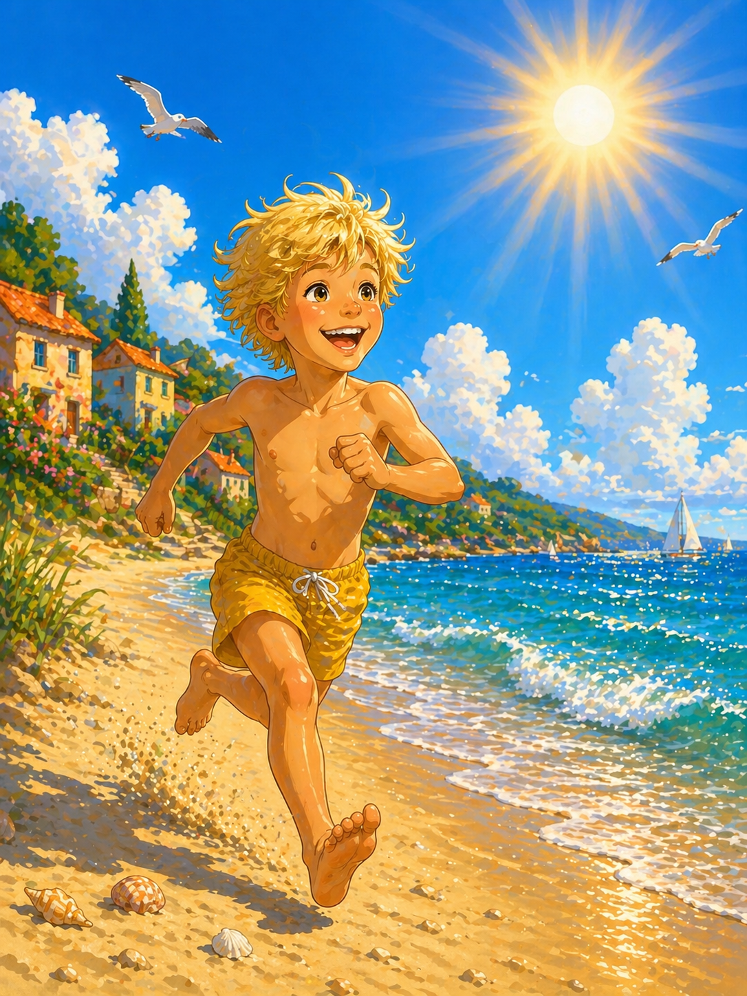 När solen sken som starkast var han som gladast. Då sprang han barfota i sanden och hoppade i det glittrande havet. Hans bästa vän Juli var alltid med honom. De hade känt varandra hela livet och gjorde nästan allt tillsammans. De skrattade mycket, badade länge och låg ofta på stranden och tittade upp i himlen.