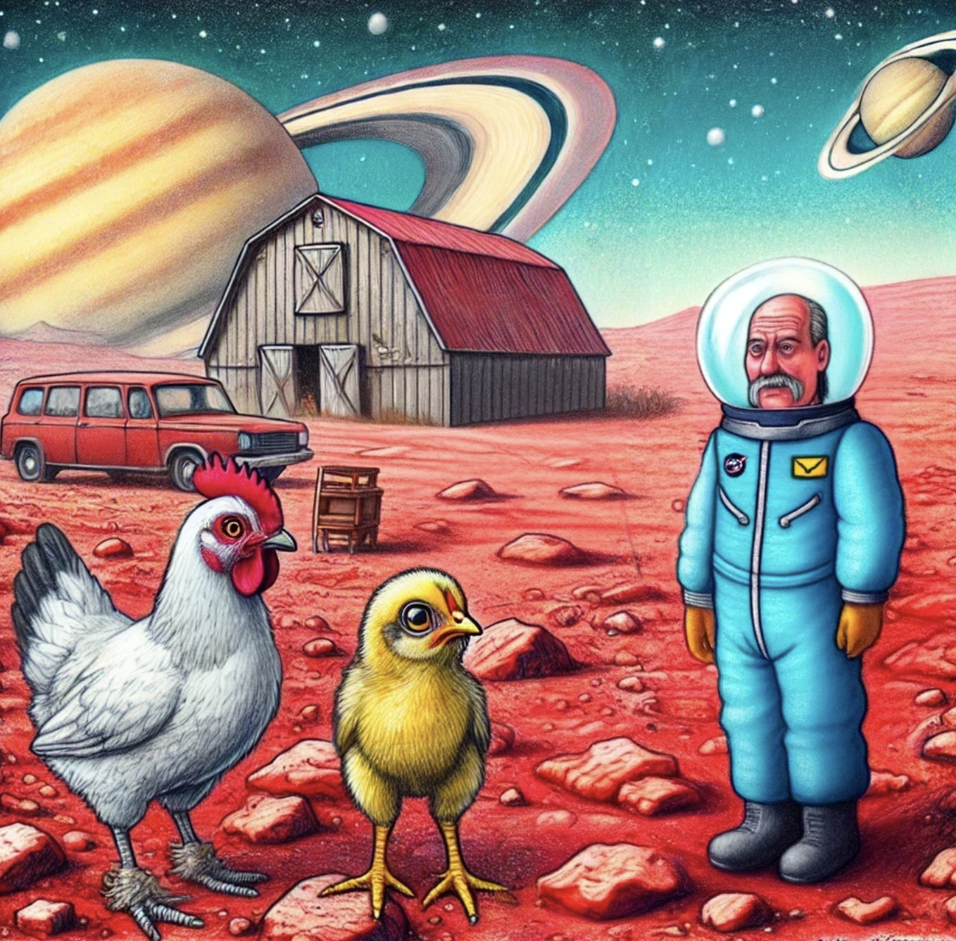 Det var en gång två höns, en tupp och en kyckling. Tuppen hette Kuckeliku och kycklingen hette Boris. De var bästa vänner och hade varit det i över fem år. De bodde på en stor bondgård med många djur på planeten Saturnus. Lars, som ägde gården, var en gammal astronaut som en gång för länge sedan kraschat på Saturnus. En kall vinternatt åkte vännerna på semester till Mars. De hade en fantastisk semester, men när de skulle åka hem upptäckte de att deras Volvo 740 var borta. Vad skulle de göra nu???