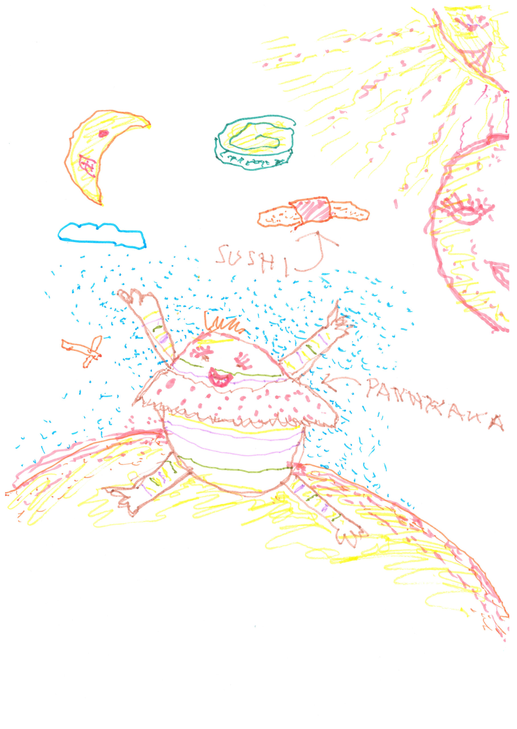Det var en gång en levande pannkaka som var regnbågig och hade en klänning som gick för att hälsa på sin bästa vän Sushi, som bodde i tre potatisar. Deras dröm var att få kolasås av pandan som hette Någon. Kolasåsen var speciell, för ingen annan hade en sådan kolasås. Sushin och pannkakan går stigen in i skogen, för längst in i hela skogen finns såsen, och det visar sig att den har krafter i sig, för om man tar en klunk blir man ostoppbar. Pandan har fått reda på det, men når inte att dricka såsen. Till slut fick pandan ner kolasåsen och upptäckte att en flygande pizza hade trollat fram att det i den fanns tre nyckelhål som man behövde tre olika nycklar till för att komma åt uppdragen. Ett av uppdragen var att komma förbi den sovande, sura chefen, och de visste att om han vaknade, skulle allt vara över…