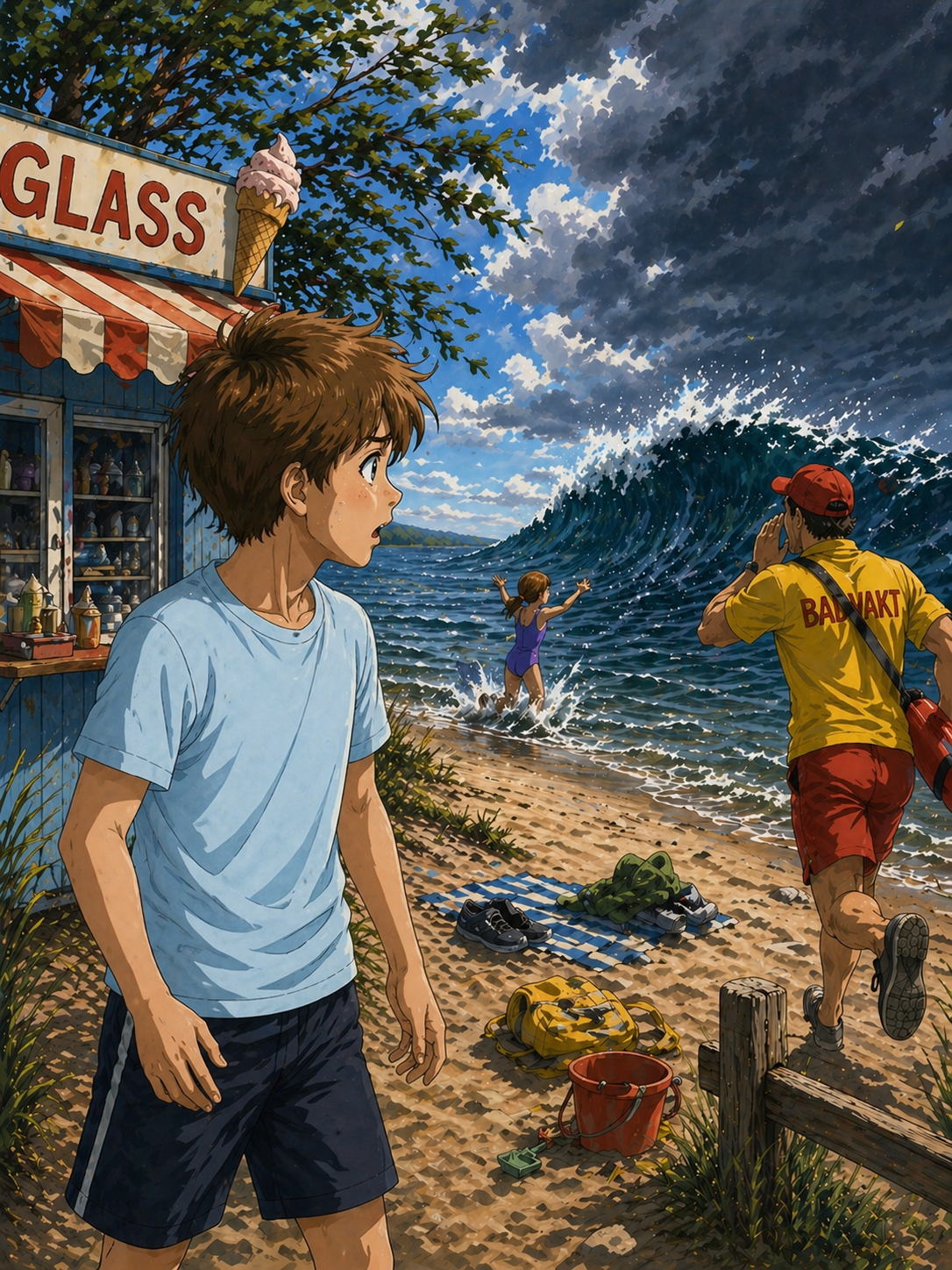 Plötsligt börjar det blåsa och en badvakt kommer springande och skriker att en jättestor våg är på väg in mot stranden. Sven tittar ut mot vattnet och blir alldeles vit i ansiktet, för där står Troja…