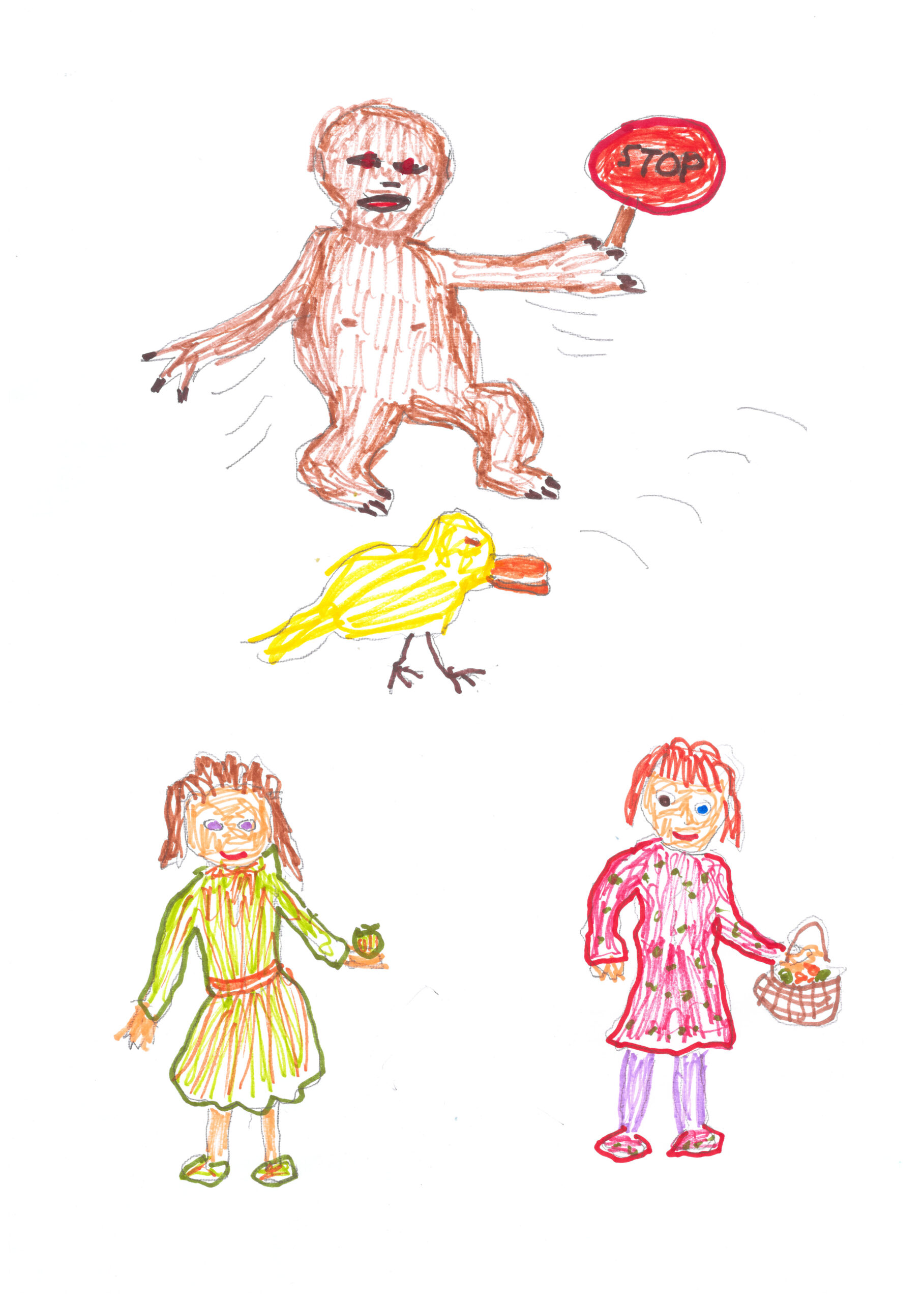 Det var en gång en jätteliten tjej i jordgubbskläder. Hon bor i ett jordgubbshus. En gång kom en tjej i äppelkläder över till hennes hus. Den lilla tjejen frågade om de kunde bli vänner för hon hade inga vänner. De ville gärna ha ett husdjur och gick till djuraffären för att köpa en anka. I djuraffären fanns en jätteanka som kunde flyga och teleportera sig. Det var ett fel på ankan men de visste inte vad det var. Men tjejerna ville ha ankan. Samtidigt i bananhuset sitter en apa och tittar i sitt teleskop och ser djuraffären och tjejerna och vill också ha ankan. Apan kan flyga så den flyger dit och stoppar dem…