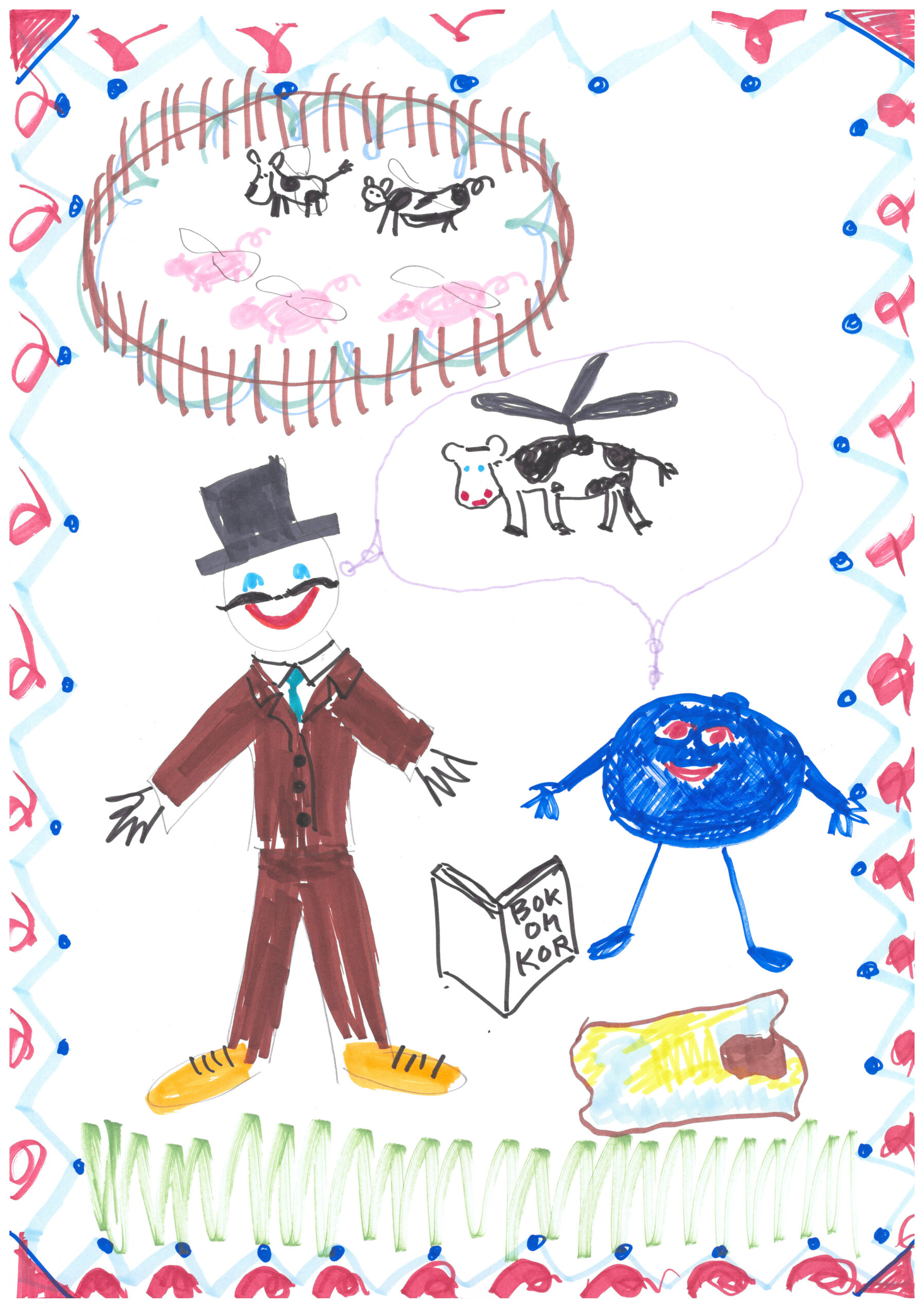 Det var en gång en glad person med mustasch, hatt och kostym: Hen hade en bästa kompis, som var ett blåbär med armar och ben. Dom tittade på en film om flygande kor och då väcktes en önskan om att ha en egen flygande ko. När de tittade på filmen sa de: Åh vad kul att ha en flygande ko, så att man kan flyga vart man vill! De bestämde sig för att söka lite för att finna var de finns. De kollade i en bok och såg var det fanns. I den boken hittade de en karta som de kunde ha med sig när de letade efter ko. De bestämde sig för att åka dagen efter, men de behövde vara väldigt försiktiga med kartan för den var gammal och ömtålig. När de kom fram till stället inser de att det finns massor av flygande kor och grisar, men de ville ha en speciell ko. Det var några andra grisar och kor som vaktade den speciella kon, den de ville ha. De försökte flera gånger att komma fram till kon, men grisarna och korna var alldeles för starka och de blev allt svagare och svagare….
