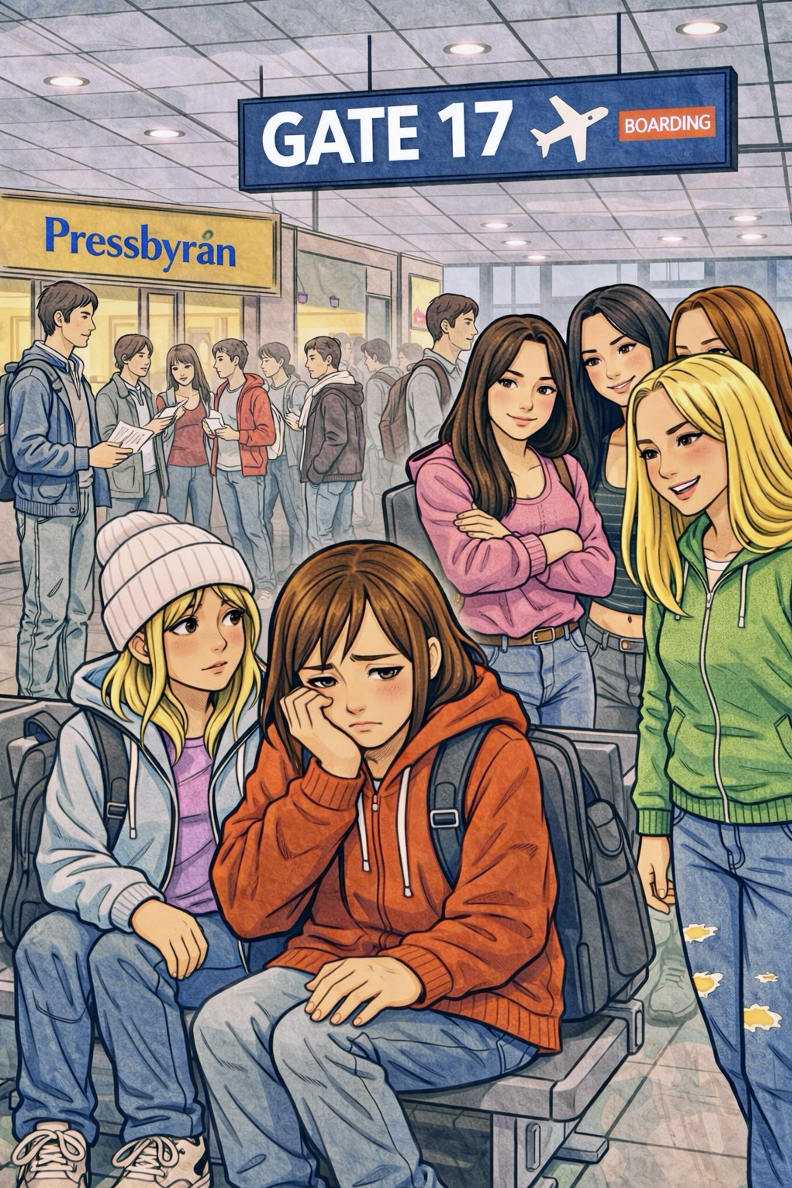 Jag ser hur alla fyra i gruppen kommer fram till oss. Jag känner hur det knyter sig i magen. De är alltid så dryga och jag känner mig så obekväm när de är på samma plats som jag. Hur ska det gå att sitta på samma flygplan som dem i så många timmar? Totalt blir det tre timmars flygresa.