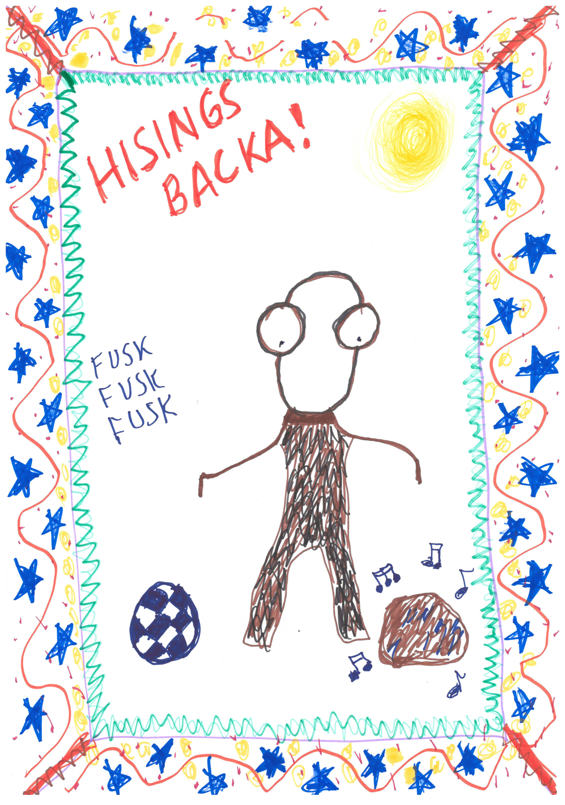 | Det var en gång en zombie och en potatis som gillade att spelafotboll. De var jätteglada förimorgon kanske de skulle få spela med Hisings Backa FC. Nästa dag spelade de match och trodde att de vann, men det andra laget fuskade så att de vann istället… |