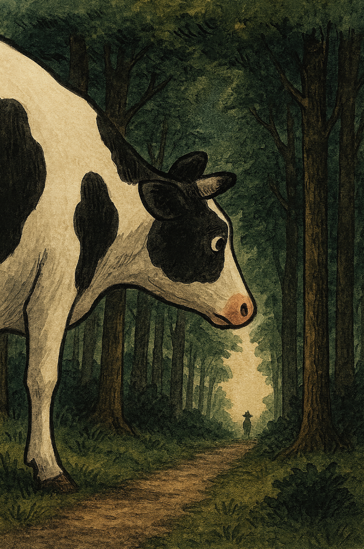Det är en läskig skog. Mörkt och otäckt. Det finns några stora fotsteg i marken. De andra korna har berättat för honom att det finns många vilddjur i skogen. Vargar och björnar som äter kor, även stora kor. Även om Bertil var en ovanligt stor ko så kände hon sig rädd.