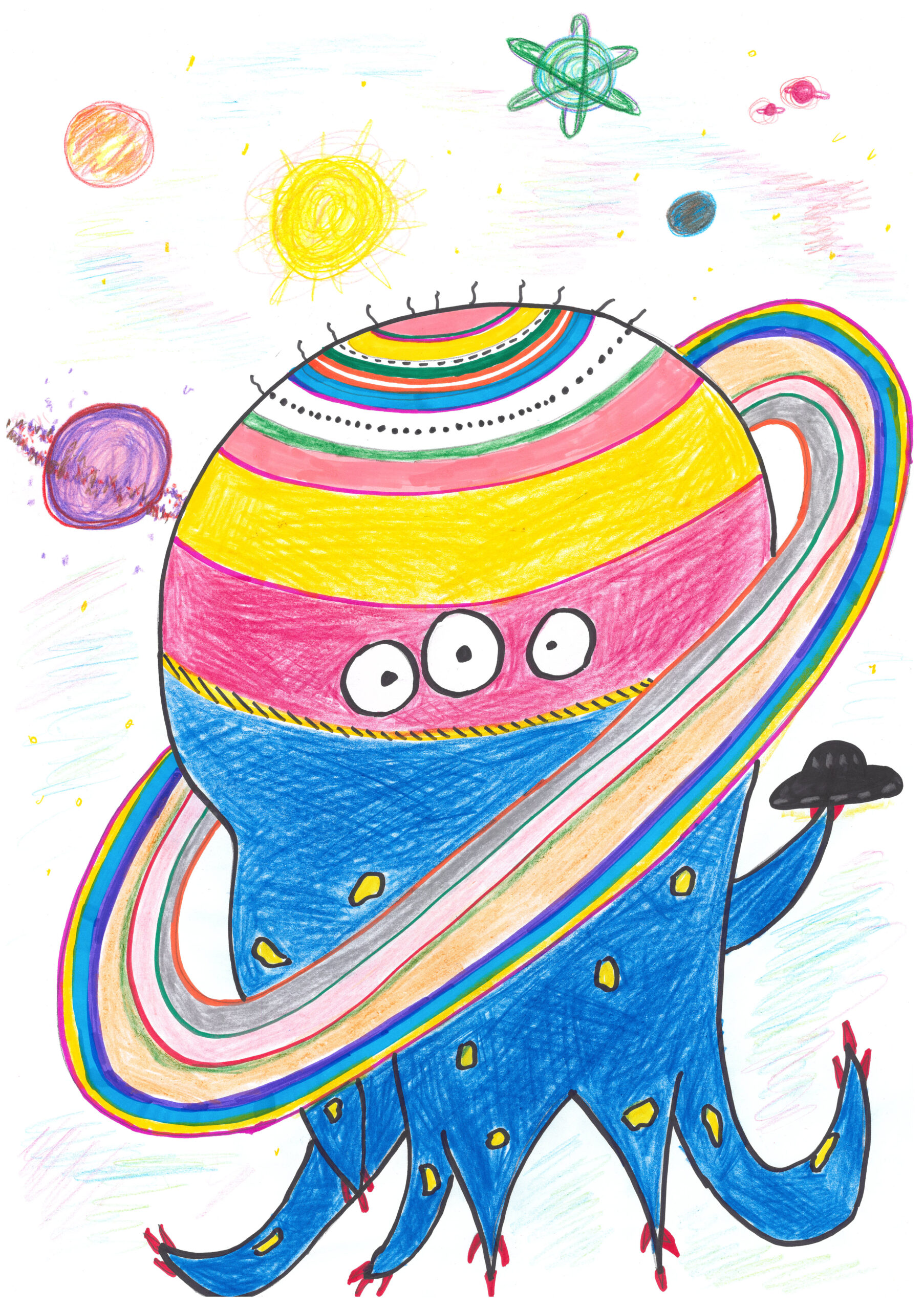 De var på ett jättestort ufo, där det fanns många rum. De var på väg till planeten Saturnus för att de skulle forska och när de landade så kom ett monster emot dem. Monstret började att jaga dem och då började det att falla meteoriter från himlen och från monstrets mun. Han använde sina klor till att slå ner meteoriterna med och han försökte även att träffa Bob och Alien-Tirko med meteoriterna…