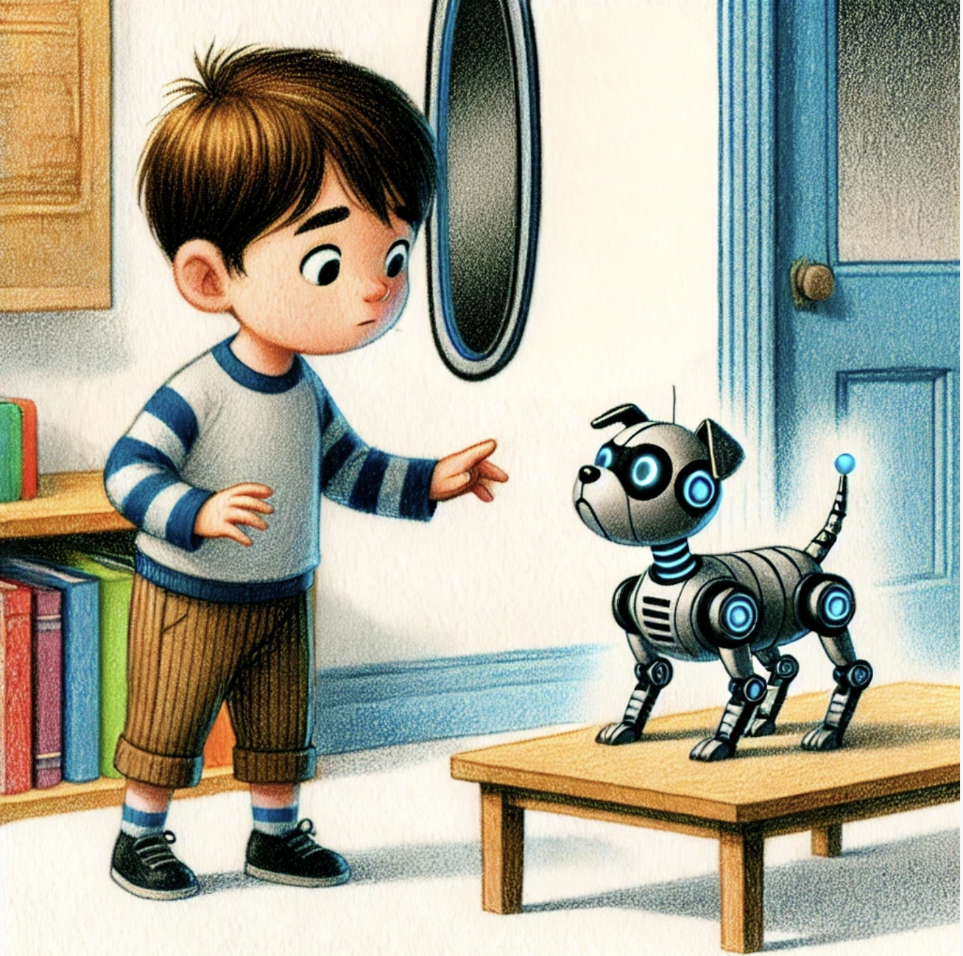 Robban vaknade och undrade var han var. Han tittade sig runt i rummet och såg något som rörde sig på ett bord. Han gnuggade sig i ögonen, reste sig och gick sakta fram till bordet. Det var en liten, grå, blänkande varelse som liknade en robothund. Han klappade den försiktigt och såg då sina händer och blev chockad. Hans händer var alldeles hårda, kalla och blänkte i silver. Han blev så chockad så att han höll på att ramla baklänges, han tittade panikslaget över vänster axel och såg en spegel. Han gick fram till spegeln och sa med hög röst: