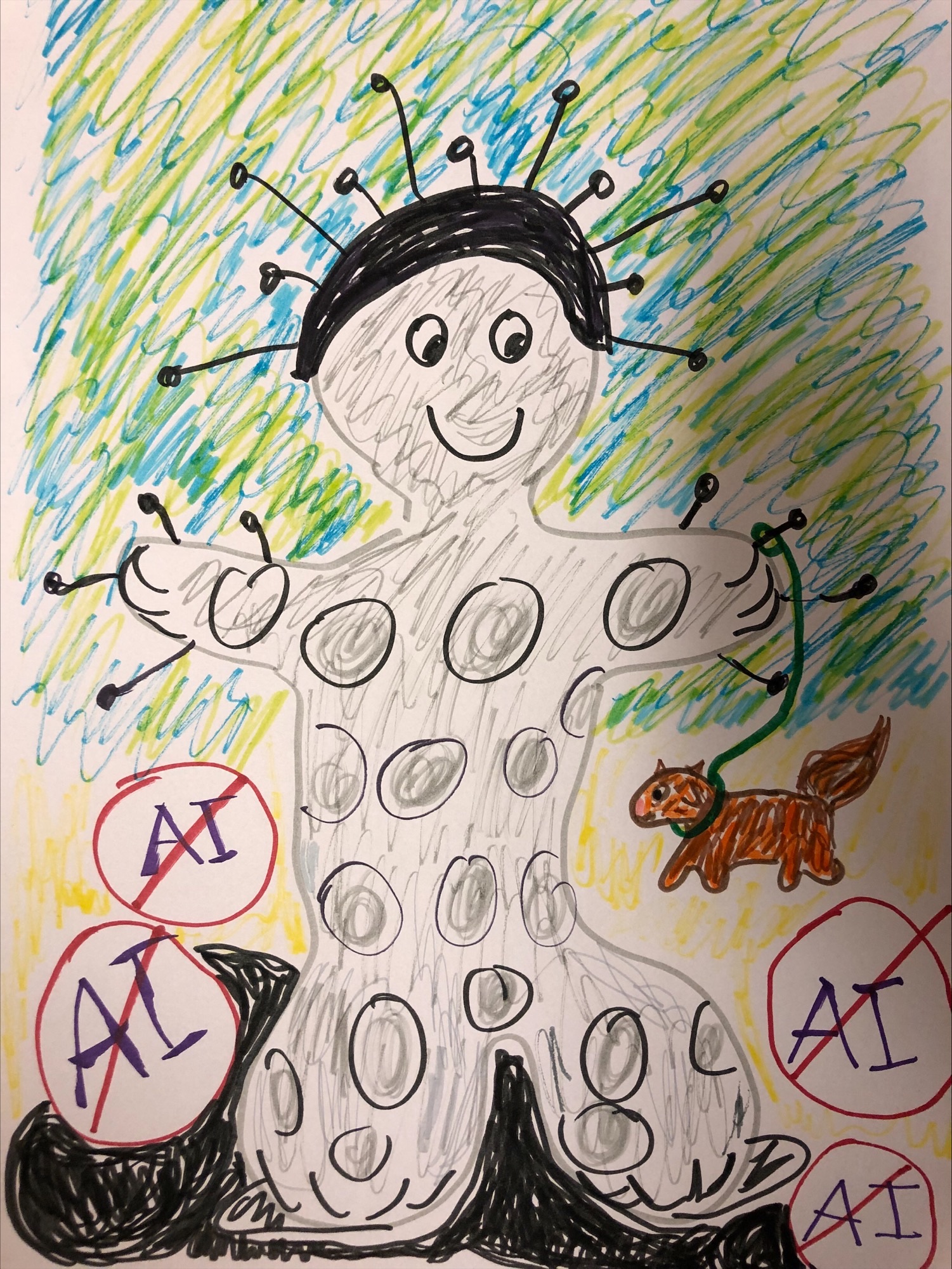 Det var en robot och en hund som var bästa kompisar. År 3050. Stockholm är förstört i framtiden. Det är 100 grader Celsius. De befinner sig i Stockholm. Det är gröna hål i marken. Himlen är grön och det är ett svart hål från rymden, och AI kommer från det svarta hålet. Om roboten kommer till det svarta hålet kan de besegra AI, men det är en stark kraft starkare än gravitationen som håller dem ifrån. Roboten och hunden måste hämta militären och polisen så att jorden inte blir upptagen från AI i det svarta hålet. Militären och polisen är på AI:s sida för att AI övertygade dem…