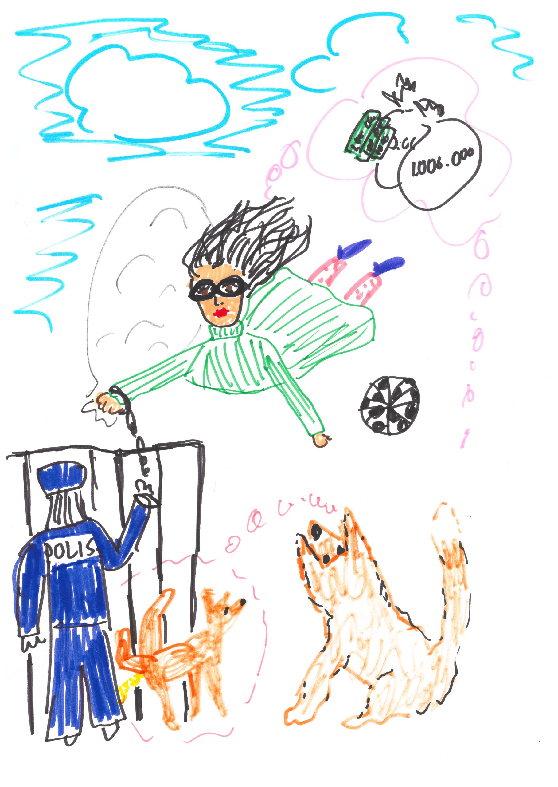Det var en superhjälte och en räv som gillade att leka tillsammans. Superhjälten och räven sov över hos varandra och dom var jättebra vänner. Sen skaffade dom ett miljonärjobb som fotbollsspelare och dom blev miljonärer. Men superhjälten åkte fast och räven försökte ta sönder stängerna och då…