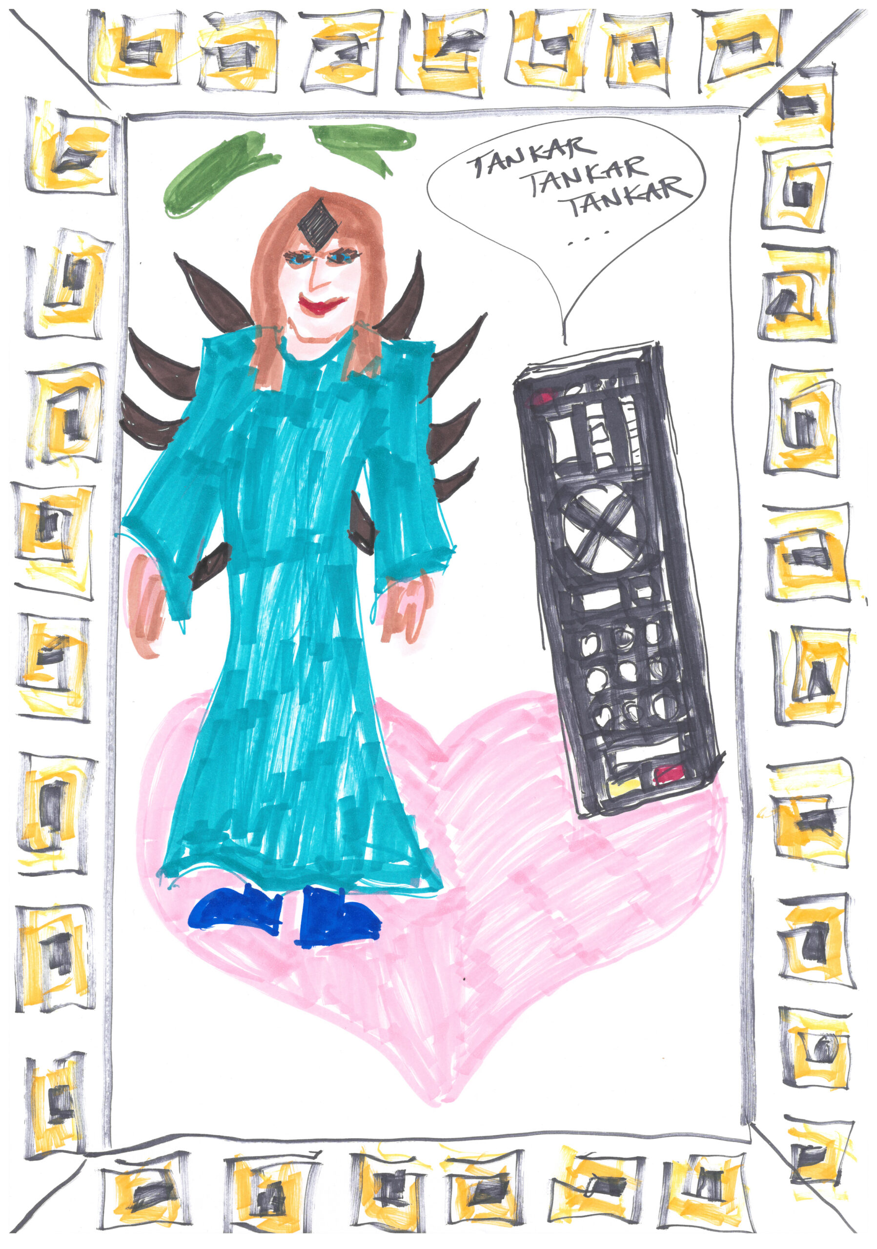 Det var en gång en tjej som hade superkrafter och taggar på sin rygg och en svart kristall i pannan. Hon hade en bästa vän som var en fjärrkontroll som kunde läsa människors tankar. Innan tjejen blev bästa vän med fjärrkontrollen hade hon en annan tjej som bästa vän. Den tjejen kunde flyga med hjälp av sina hårspännen. En gång råkade hon nästan fälla ner ett träd. När tjejerna var bästa vänner kom det en massa forskare och tog tjejen som kunde flyga. Tjejen med taggarna försökte hjälpa henne men lyckades inte. Därför ville hon vara bästa vän med fjärrkontrollen för alltid. Fjärrkontrollens mamma började ställa frågor om bästa vännen och när hon fick veta att hon var en människa sa hon: -Nej, du kan inte vara vän med en människa……