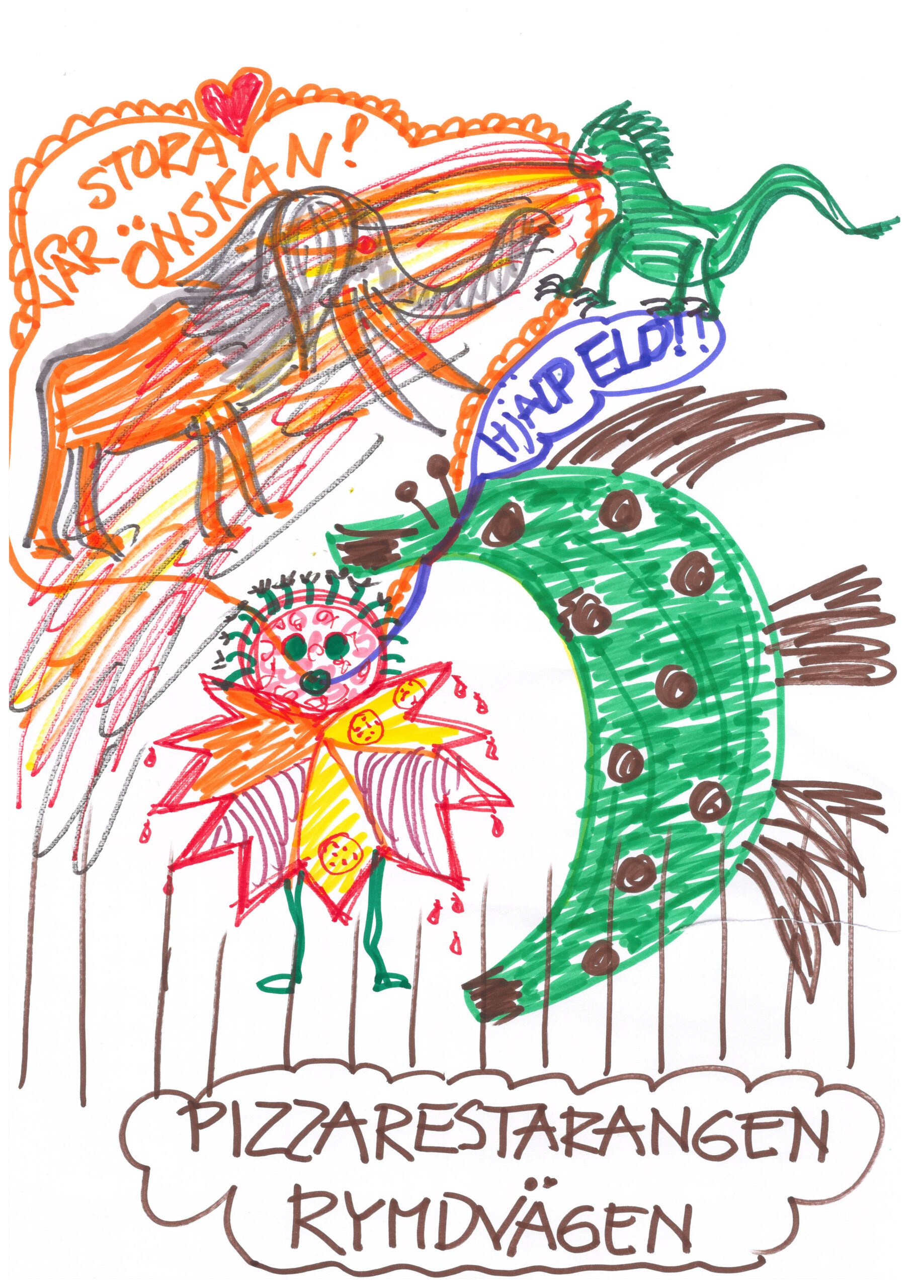 Det var en gång ett pizzamonster och dens bästa vän en flygande banan. Dom bor i köket på en pizzarestaurang mitt ute på landet. Gatan heter rymdvägen. Pizzarestaurangen var ett pizzafängelse där dom hade hamnat, för några restaurangkillar hade satt dem där eftersom pizzan sprutade en massa ost på en tjej, så bananen tog med sig pizzan och flög iväg. Deras högsta önskan är att ha en babaloba men det svåra är att en eldsprutande drake vaktar vägen…